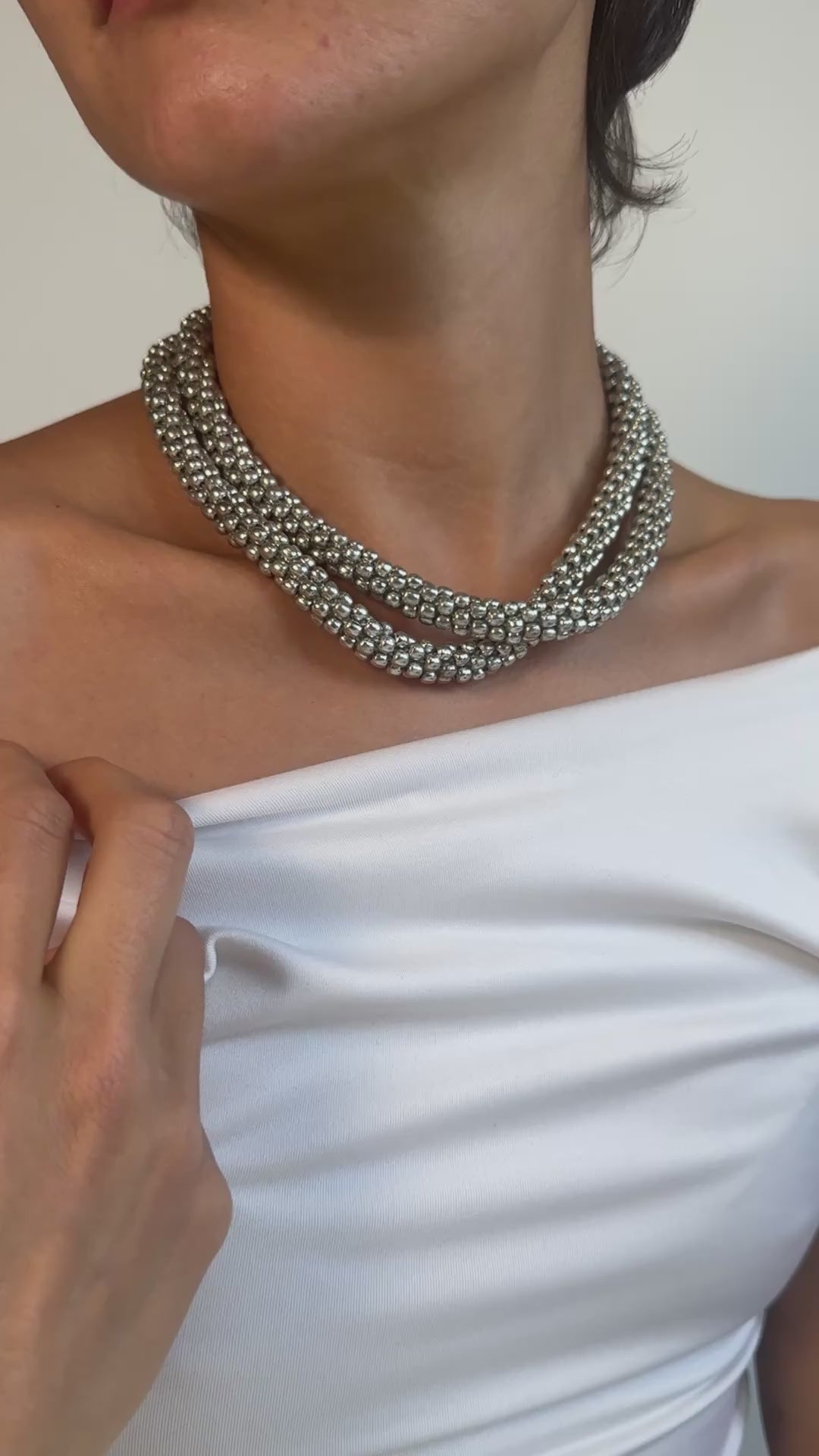 Unsere BOLD Roll-on-Kette mit Karabiner lässt sich vielseitig tragen – als elegantes Schlüsselband oder als Kette, einfach oder doppelt um den Hals gelegt. Große, hochwertig versilberte Messingperlen werden kunstvoll gehäkelt und verleihen diesem Stück eine edle, kühle Eleganz mit Charakter.