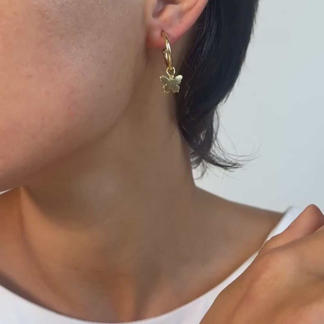 Elegante Kreolen mit einem feinen, baumelnden Mini-Anhänger: ein zarter Schmetterling, Symbol für Veränderung, Leichtigkeit und neue Anfänge.