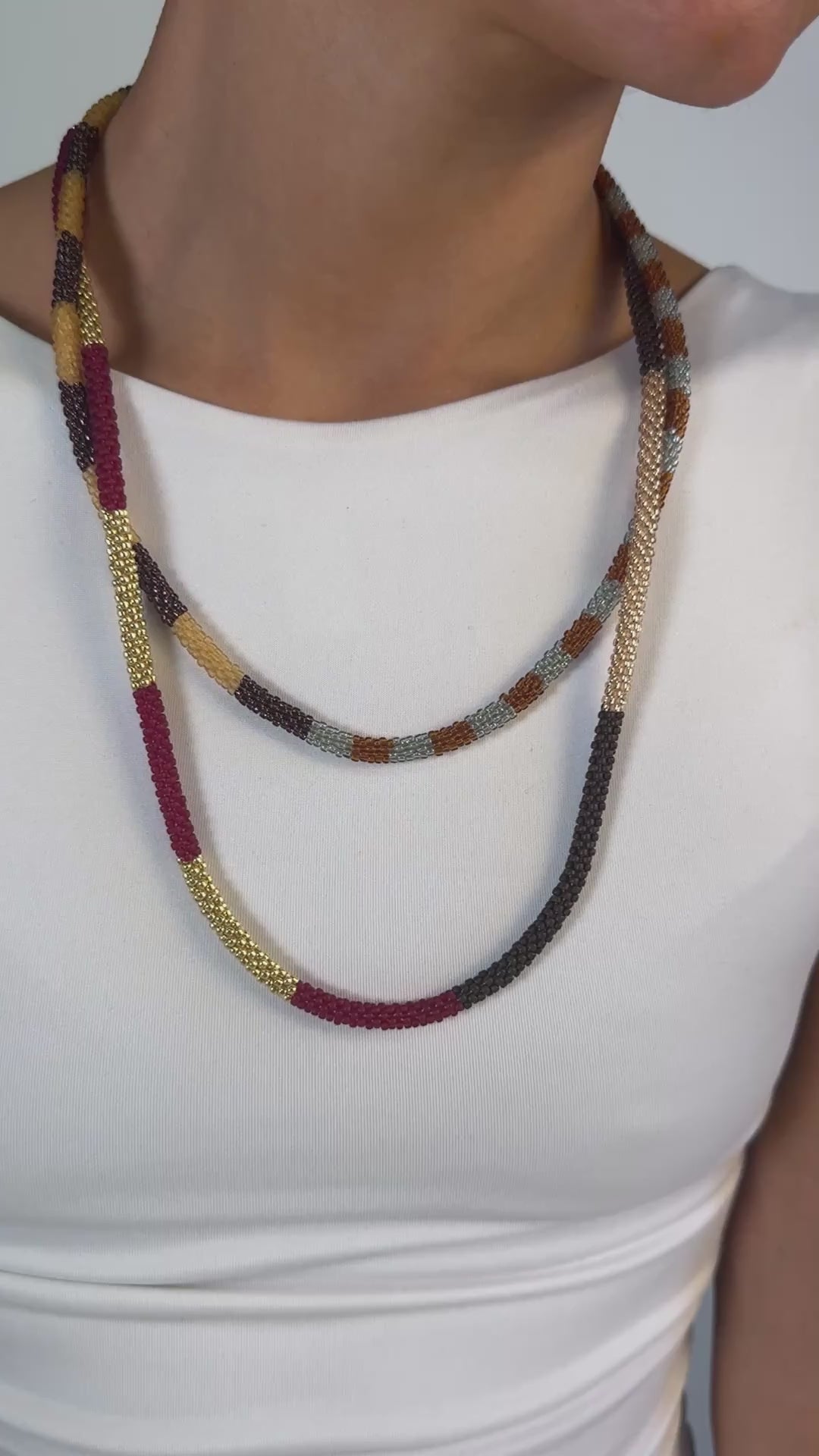 Jede Kette wird von einer Frauenkooperation in Nepal in aufwändiger Handarbeit gefertigt. Die Farbspektren werden sorgfältig zusammengestellt, hochwertige japanische Glasperlen aufgefädelt und kunstvoll verhäkelt – die Fertigung eines einzigen Stücks dauert rund 1,5 Tage.