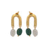 Les boucles d'oreilles Audrey présentent deux pierres semi-précieuses de taille ovale différente qui pendent d'un arc légèrement asymétrique, créant un accroche-regard particulier dans l'oreille.