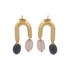 Les boucles d'oreilles Audrey présentent deux pierres semi-précieuses de taille ovale différente qui pendent d'un arc légèrement asymétrique, créant un accroche-regard particulier dans l'oreille.
