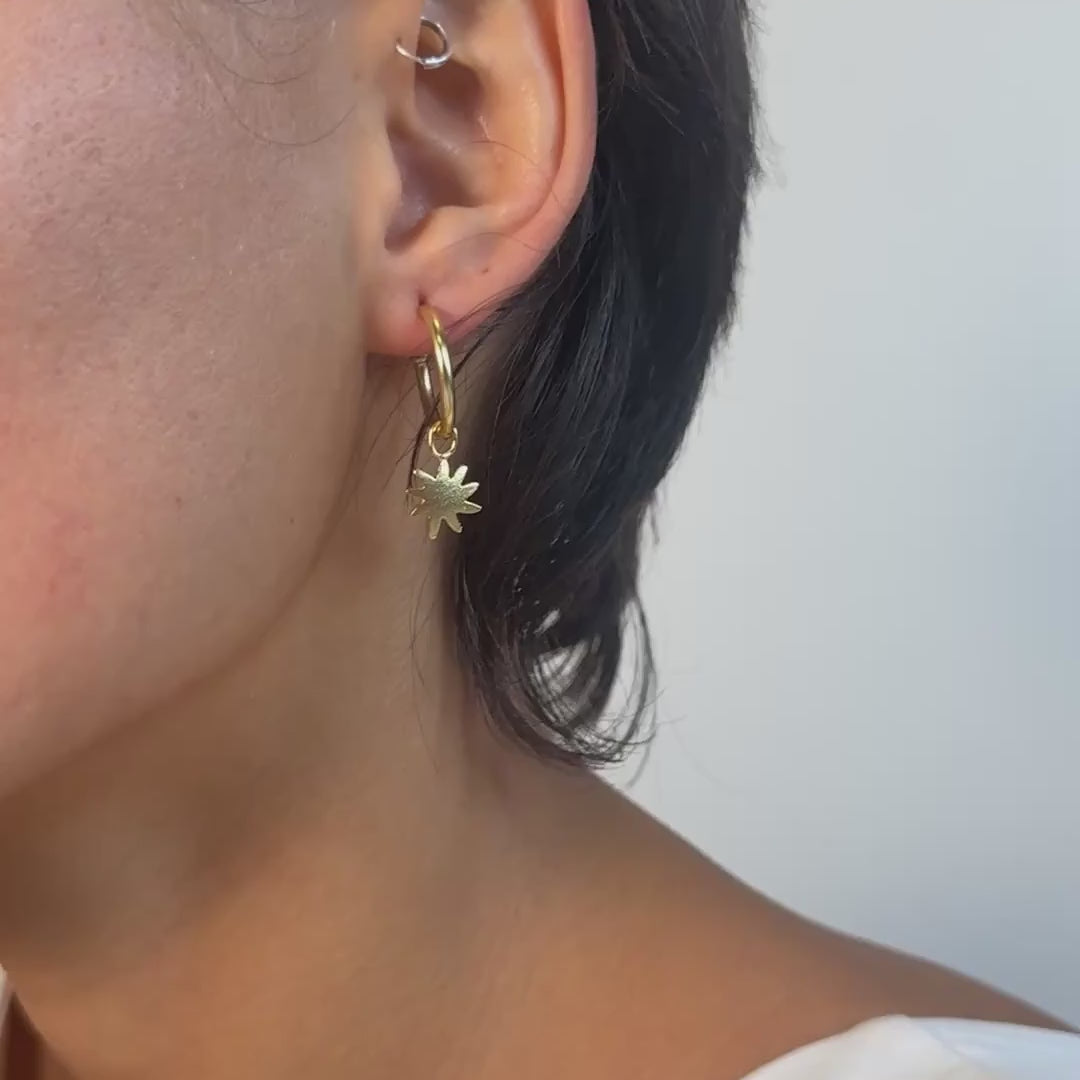 Elegante Kreolen mit einem feinen, baumelnden Mini-Anhänger: ein funkelnder Stern, der für Hoffnung, Klarheit und innere Stärke steht.
